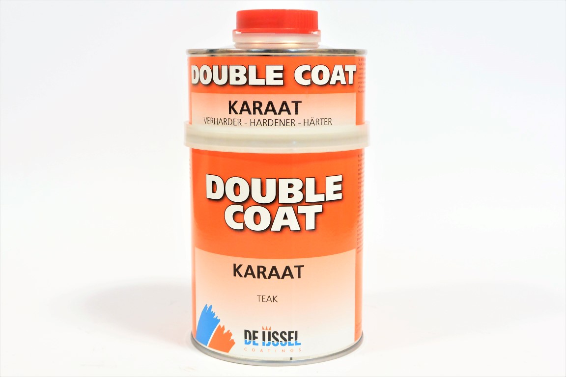 Double Coat Karaat is een high solid twee componenten transparante aflak op basis van verzadigde polyesterharsen, transparante pigmenten en gemodificeerde alifatische isocyanaten en UV filters. Verbruik: circa 10 m2 per 750 ml. Het praktisch rendement is afhankelijk van een aantal factoren, zoals de vorm van het object, de conditie en het profiel van het oppervlak, de methode van applicatie, de weersomstandigheden en het vakmanschap van de applicateur.
